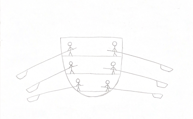 三段櫂船とは、その名の通り、船が三段になっており、各段に漕手が何十人と並べられて、人力で船を進めるという現代の戦艦のようなものです(下図参照)。サラミスの海戦などで活躍したと言われており、当時有力なポリスの一つであったアテネの三段櫂船はなんと最高時速18kmは出たとか。