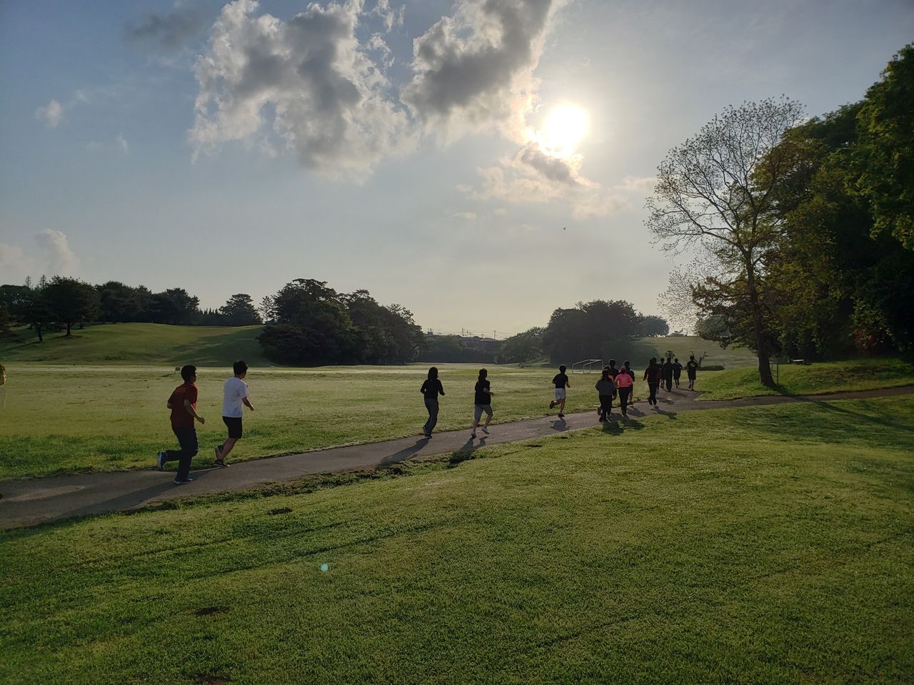 早朝のジョグ、朝日が煌き新人達の門出を祝福しているようです。