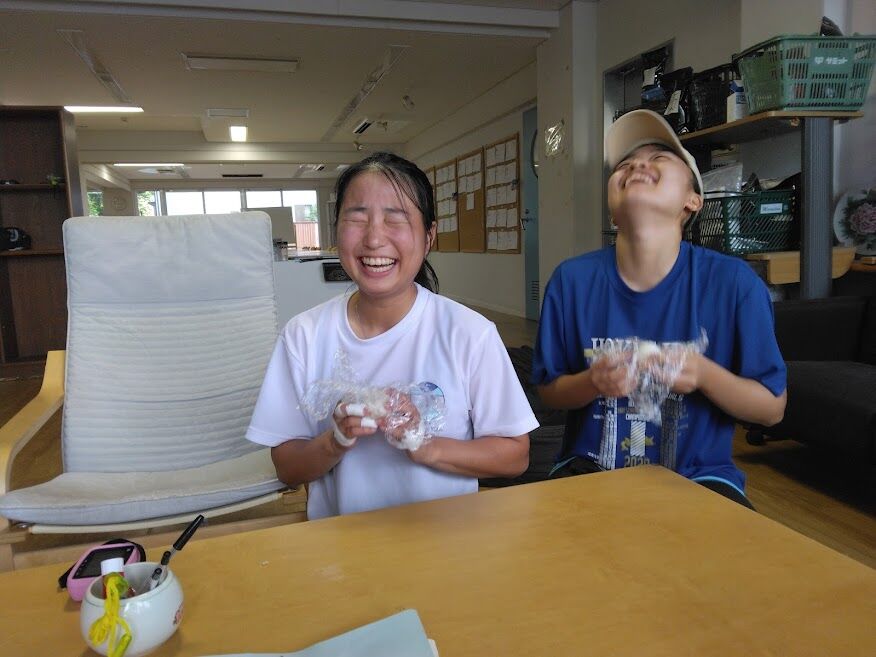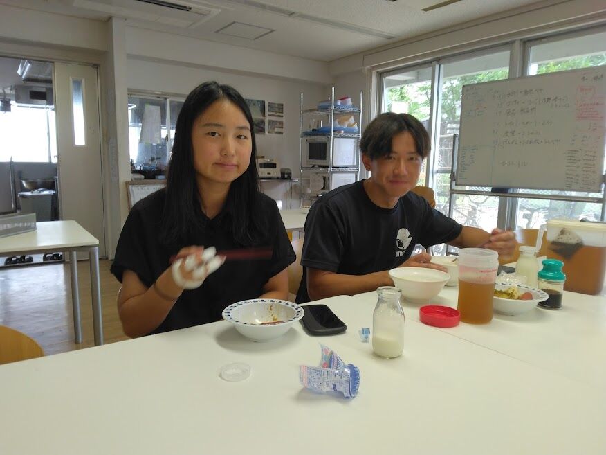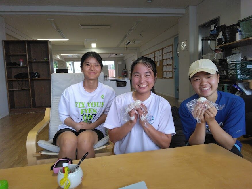 (乗艇後のおにぎりショット。梶谷のおにぎりに塩をふったのは青木です)
